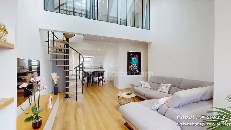 La pièce de vie de 36m2 aux beaux volumes, traversante, lumineuse toute la journée bénéficie d'une belle cuisine ouverte entièrement aménagée et équipée.