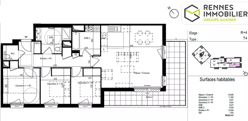 | 88,83 m² - 4 pièces - 3 chambres | Dernier étage (4ème) avec ascenseur |