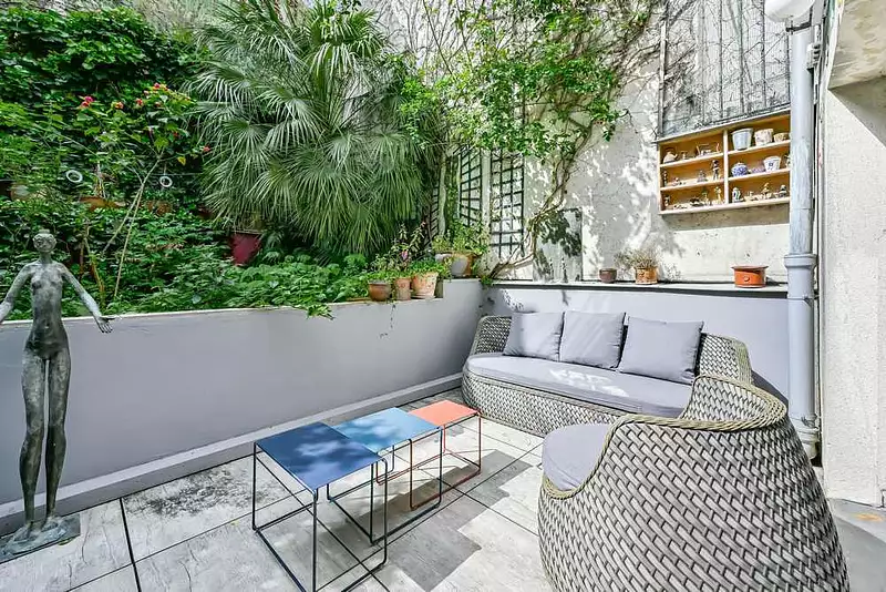 Un jardin à Montmartre ! A quelques pas du Sacré-Cœur, du Marché Saint-Pierre, de la rue Lamarck et du Square Louise Michel, appartement en parfait état de 74m2, sa terrasse de 18m2, son jardin de 23m2 et un parking en RDC.