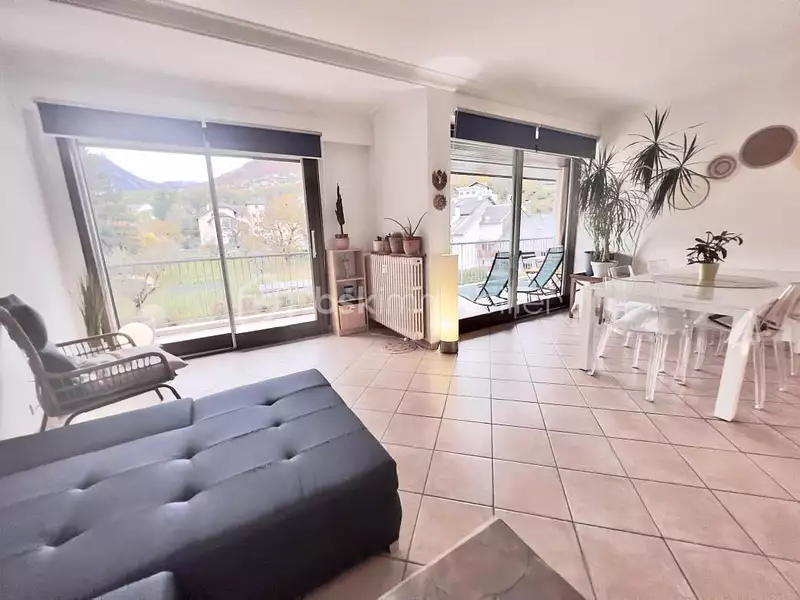 Le séjour lumineux de 27 m², agrémenté de grandes baies vitrées, s'ouvre également sur cette même terrasse carrelée, offrant un espace de vie convivial et une vue dégagée sur les montagnes.