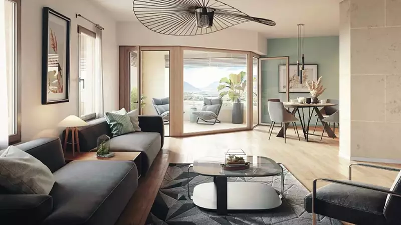 Sur la commune de Ferney-Voltaire, en plein coeur du nouveau quartier Ferney-Genève Innovation, dans une résidence moderne et écologique avec patios, vergers, allées arborées et potager commun, appartement 4 pièces de 89.50 m² au 3ème étage composé d'une entrée avec placard, d'un séjour/cuisine de 31.70 m² donnant sur une loggia de 10 m², d'une suite parentale avec sa salle d'eau attenante, de deux chambres dont une avec placard, d'une salle de bains avec wc et d'un wc séparé.