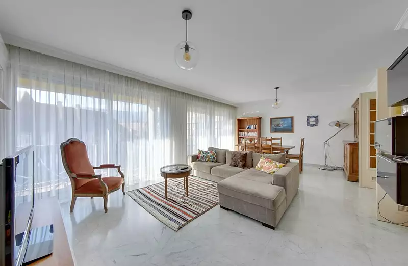 Dès l'entrée, un vaste hall distribue harmonieusement l'ensemble des pièces. Le séjour double, climatisé et baigné de lumière grâce à son exposition Sud-Ouest, s'ouvre sur un agréable balcon, offrant un espace extérieur idéal. Le sol en marbre apporte une touche d'élégance supplémentaire à cette pièce de vie spacieuse.