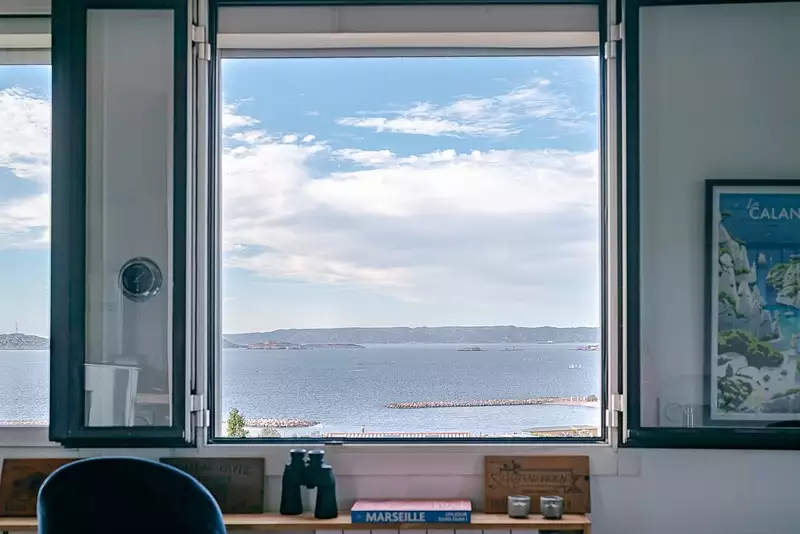Dès l'entrée, un dressing d'arrivée accueille vos effets personnels avant de découvrir un vaste séjour lumineux de 53m2 avec salle à manger et cuisine ouverte entièrement équipée, le tout prolongé par une terrasse offrant une vue panoramique exceptionnelle sur la mer, les îles, Notre-Dame de la Garde et la ville de Marseille.
