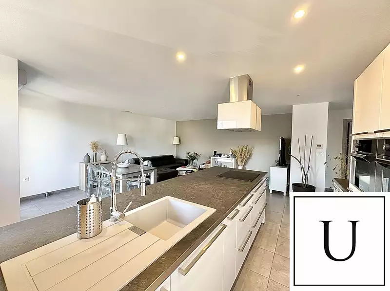 Grand séjour-cuisine d'environ 40 m2 avec cuisine américaine.