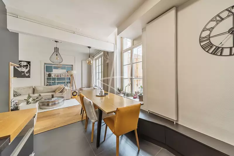 Le séjour lumineux avec cuisine ouverte bénéficie d'une belle hauteur sous plafond (3 m), d'un parquet massif et d'un accès à un espace extérieur.