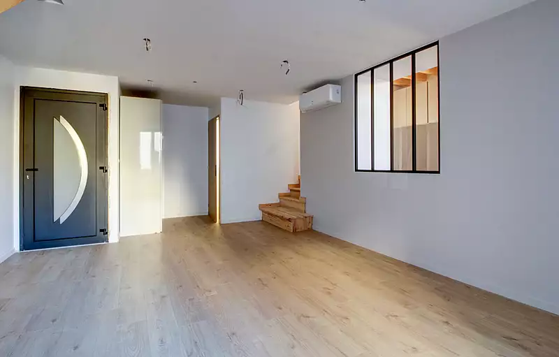 A deux pas des commerces et avec un accès immédiat à la gare, Sixième Avenue présente en exclusivité un duplex de 91,5 m², situé au premier étage d'un immeuble ancien entièrement rénové. Le premier niveau offre une pièce de vie chaleureuse, pensée pour créer une ambiance intime et confortable. La cuisine attenante, entièrement aménagée et équipée, a été conçue avec des matériaux de qualité et un agencement fonctionnel. Ce niveau comprend également un WC indépendant. L'étage accueille deux chambres dotées de rangements sur mesure, optimisant chaque espace disponible. La salle de bain avec douche à l'italienne et baignoire a été réalisée avec des équipements de qualité, une robinetterie haut de gamme et des finitions soignées. Un second WC complète cet étage, ajoutant un confort supplémentaire au quotidien. L'ensemble du duplex bénéficie d'une rénovation complète : menuiseries récentes, isolation revue, choix de matériaux contemporains, sols de qualité, éclairages intégrés, rangements parfaitement adaptés aux volumes. Chaque détail a été pensé pour offrir un niveau de prestations supérieur et un confort durable. Un balcon, rare en plein centre-ville, vient parfaire cet ensemble. Un bien rénové avec exigence et finesse, idéal pour ceux qui recherchent un cadre de vie soigné au coeur de Meximieux. Nous vous invitons à le découvrir. Copropriété de 4 lots ().