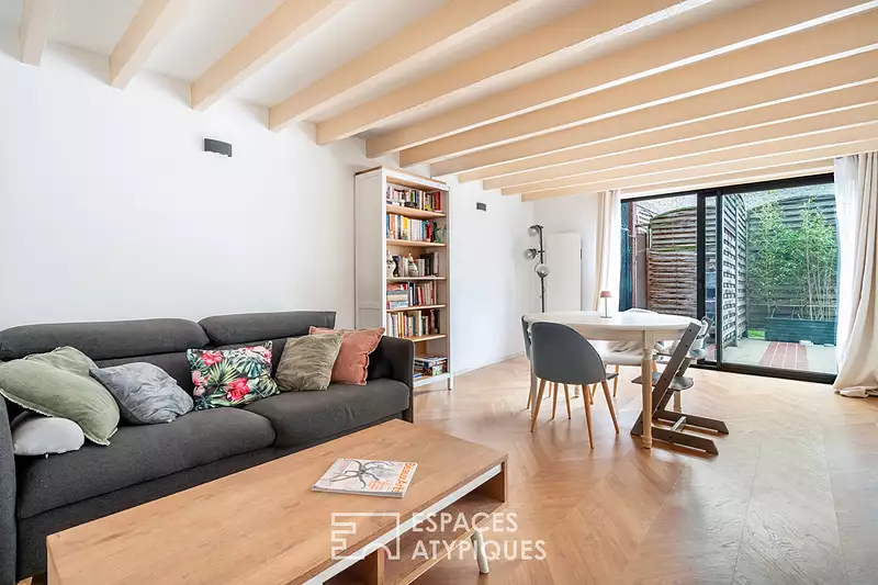 Dans une petite rue calme du Kremlin-Bicêtre, à deux pas des portes de Paris, ce duplex de 92 m² Carrez déploie ses volumes en transparence et en lumière, entre douceur domestique et inspiration contemporaine. Situé en rez-de-chaussée d'un immeuble des années 70, il s'ouvre sur un espace de vie chaleureux, à la fois fonctionnel et poétique. Le salon, baigné de clarté par de larges baies vitrées, s'étire vers une vaste terrasse pavée de 45 m², véritable prolongement extérieur sans vis-à-vis où le végétal compose un tableau apaisant. Les poutres apparentes et le parquet à bâtons rompus confèrent à la pièce un charme artisanal, que viennent adoucir des tonalités claires et une décoration sobrement éclectique. Dans le prolongement, la cuisine semi-ouverte associe élégance et efficacité : façades bleues mates, plan de travail en marbre veiné, sol en carreaux hexagonaux mêlant motifs et unis. L'ensemble dégage une atmosphère de quiétude et d'harmonie, où chaque détail semble pensé pour concilier esthétique et quotidien. Au même niveau, une pièce à usage de couchage d'enfant, éclairée lumière en second jour grâce à une verrière, ainsi qu'une salle d'eau avec toilettes complètent cet espace. L'étage, accessible par un escalier léger, dévoile un palier accueillant un bureau ouvert, propice au travail ou à la lecture, et distribue une seconde chambres d'enfant dotée d'une verrière intérieure ainsi qu'une chambre parentale baignée d'une lumière douce. Une salle de bain avec second WC parachève l'ensemble, conférant au lieu un équilibre entre intimité et convivialité familiale. La terrasse, à la fois vaste et protégée, compose un écrin rare dans ce secteur : un espace extérieur que l'on investit à toute heure, entre petit-déjeuner au soleil et longues soirées d'été. Un box en sous-sol vient parfaire le confort de ce bien. Au coeur du Kremlin-Bicêtre, l'adresse profite d'un environnement vivant et recherché. Les commerces de bouche, les cafés et les artisans de qualité se déploient à quelques minutes de marche, tandis que les établissements scolaires réputés et les équipements culturels participent à la vitalité du quartier. La proximité immédiate de Paris ? à cinq minutes seulement de la porte d'Italie ? ainsi que les transports en commun (métro ligne 7-14 "Le Kremlin Bicêtre" ou "Maisons Blanche" et nombreuses lignes de bus) assurent une connexion fluide avec la capitale. Bien soumis au statut de la copropriété. Métro Ligne 7-14 « Le Kremlin Bicêtre » ou « Maison Blanche » : 5 minutes à pied Commerces : 5 minutes à pied Écoles : 5minutes à pied CLASSE ÉNERGIE : E / CLASSE CLIMAT B : Montant moyen estimé des dépenses annuelles d'énergie pour un usage standard, établi à partir des prix de l'énergie de l'année 2021 : entre 1508 euros et 2040 euros. Les informations sur les risques auxquels ce bien est exposé sont disponibles sur le site Géorisques : https://www.georisques.gouv.fr Contact : Balthazar - 07 66 36 29 98 - Agent Commercial - RSAC : 534 060 124 Créteil Copropriété de 1043 lots - dont 332 lots habitation. (Pas de procédure en cours). Charges annuelles : 1050 euros. Balthazar BRIGAUD (EI) Agent Commercial - Numéro RSAC : 534060124 - Créteil.