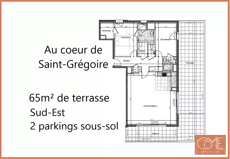 GRAND TYPE 3 de 92,40m² - TERRASSE DE 65m² - AVANT-DERNIER ÉTAGE - SUD-EST- CENTRE-VILLE - SAINT-GRÉGOIRE 35760 Côme a le plaisir de vous présenter ce très bel appartement de 92,40m² situé au 3ème étage sur 4 avec ascenseur d'une résidence de standing. Cet appartement se compose d'une entrée avec placard, d'un spacieux séjour-cuisine de 43,24m² bénéficiant de grandes baies vitrées coulissantes au SUD et à l'EST donnant accès à une magnifique terrasse de 65,77m², Cet appartement vous propose une suite parentale avec dressing et salle d'eau et une seconde chambre avec salled 'eau et accès à la terrasse à l'Est. Un cellier et un WC complètent ce bien. Deux parkings en sous-sol sont vendus avec cet appartement, pour votre confort au quotidien. Vous êtes au centre du centre ! Situé en plein coeur de Saint-Grégoire, vous aurez tout à portée de main : commerces, écoles, transports en commun et autres commodités. La gare de Rennes est accessible en direct via le bus C1, les chemins de halage, le canal et l'écluse sont accessibles à 800m pour vos moments de détente. Disponible dans douze mois Consultez une partie de nos offres sur notre site come - immobilier . fr Tous nos biens ne sont pas en ligne, n'hésitez pas à nous contacter directement Les informations sur les risques auxquels ce bien est exposé sont disponibles sur le site Géorisques : www.georisques.gouv.fr Réf. EM-1977
