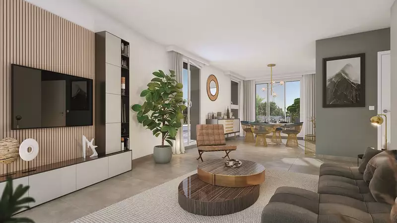 Le véritable atout de cet appartement est sa grande terrasse de 65 m², qui longe toute la pièce de vie et offre une belle vue dégagée sur les montagnes environnantes.