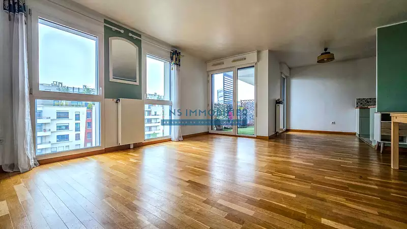 Une entrée avec placard, un spacieux séjour de plus de 30m2 (possibilité d'ouverture) donnant sur son balcon d'env. 6m2, une cuisine aménagée et entièrement équipée ouverte, quatre chambres dont une avec placard, une salle de bains avec WC, une salle d'eau et un WC séparé.