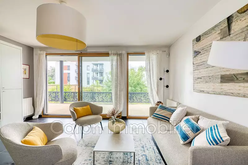 Un spacieux séjour de 38 m² avec une cuisine ouverte moderne équipée (appareils BOSCH/SIEMENS) et un îlot central, idéal pour vos moments en famille ou entre amis.