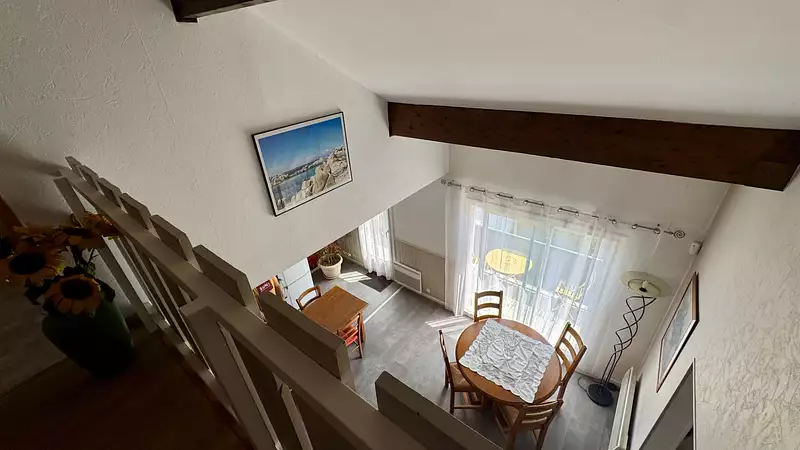La cuisine, aménagée et entièrement équipée, s'ouvre sur un balcon exposé plein Sud, accessible également depuis la salle à manger et le séjour, offrant ainsi un espace de vie baigné de lumière tout au long de la journée. Une chambre , une salle d'eau fonctionnelle et des toilettes séparées complètent ce niveau.