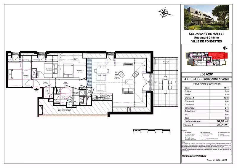 Situation: Les Jardins de Musset sont situés à Fondettes, à seulement 8 km de Tours ; Emplacement résidentiel et privilégié, proche de l'hyper-centre et de la nature ; A 3 minutes à pied de l'arrêt de bus "Les Roncières". Description: Résidence composée de 36 appartements neufs, du 2 au 4 pièces ; Chaque logement dispose d'un extérieur privé : balcon, terrasse ou jardin ; Architecture élégante et inspirée du style tourangeau. Prestation: Matériaux durables et respectueux de l'environnement ; Espaces extérieurs partagés : jardin signature favorable à la biodiversité ; Locaux vélos sécurisés et places de stationnement avec prises pour véhicules électriques. Sécurité: Résidence close et sécurisée, avec accès réservé aux résidents. Qualité : Conforme à la Réglementation Environnementale 2020 (RE 2020) ; Étiquette énergétique basse consommation (? 70 kWh/m²/an). Accès : A 20 minutes en voiture de Tours et à 1h16 en train de Paris ; Proximité des lignes de bus 11 et 58 pour rejoindre les commodités locales ; Accès facile aux écoles, commerces, et équipements sportifs et culturels. (5.00 % honoraires TTC à la charge de l'acquéreur.) Copropriété de 70 lots - dont 25 lots habitation. (Pas de procédure en cours). Charges annuelles : 640 euros.
