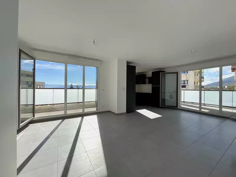 Appartement situé en plein centre de Gex, dans le nouveau quartier Coeur de ville, à proximité directe de toutes les commodités et transports en commun. L'appartement est situé au dernier étage, et bénéficie de deux spacieuses terrasses, l'une exposée Sud avec vue sur les Alpes, l'autre exposée Ouest avec une vue sur Gex et le Jura. L'appartement est vendu avec une place de garage (box) en sous-sol. Il est organisé de la façon suivante : - Entrée avec placard et vestiaire - Séjour et cuisine donnant accès aux deux terrasses - Une salle de bains avec toilettes et emplacement pour machine à laver - Une chambre en suite avec grands placards et salle de douches avec toilettes - Deux chambres avec placards Cet appartement entièrement équipé y compris cuisine et placards, n'a jamais été occupé. Il est donc en parfait état et est au bénéfice des garanties décennales. C'est un bien à découvrir pour ceux recherchant un appartement de trois chambres sans travaux, en plein centre-ville, au dernier étage et avec de spacieuses terrasses.