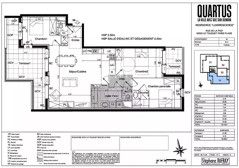 Situé au 3ème étage de la résidence Luminescence, T4 de 94,19m² composé de :