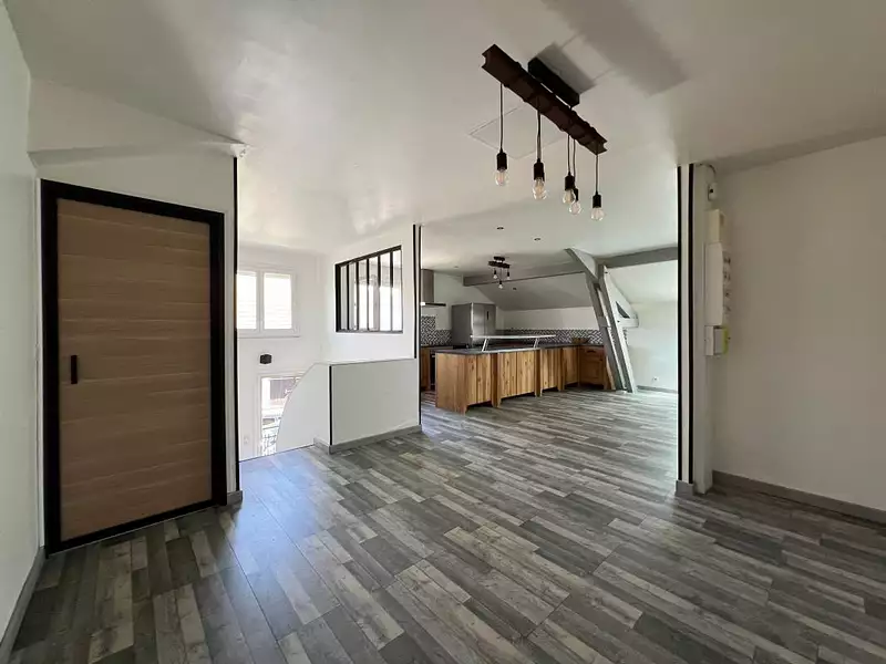 L'appartement comprend une entrée, un bel espace de vie d'environ 45 m² avec poutres apparentes, verrière et une cuisine récente équipée, 2 grandes chambres avec dressing et balcon, une salle de bain lumineuse avec baignoire et douche et un WC séparé.