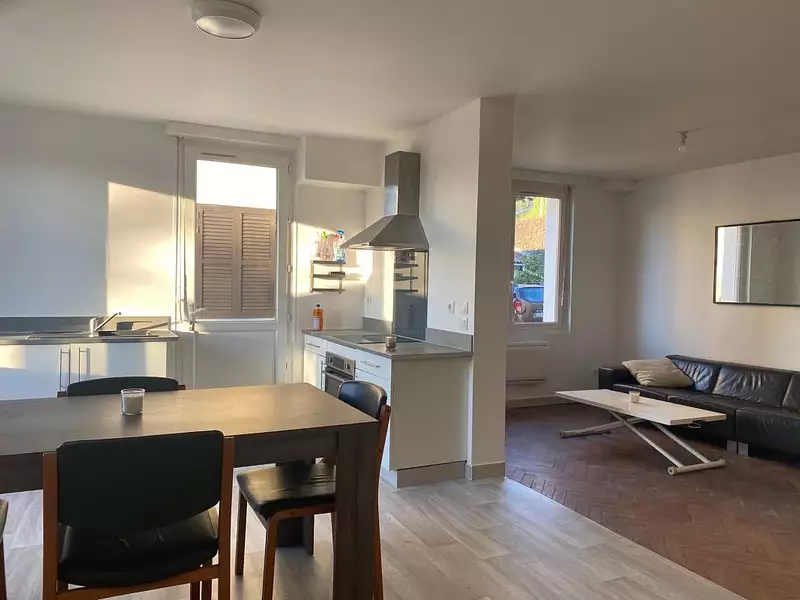 Grande pièce de vie lumineuse avec cuisine aménagée.