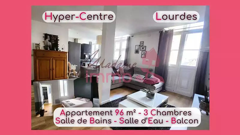 LOURDES Hyper Centre - Chez Madame Immo, Beaucoup de Charme pour cet Appartement de 96m² avec balcon filant EST. Vous disposerez d'un agréable séjour/cuisine semi équipée, avec portes fenêtres donnant sur balcon Est - deux jolies chambres avec placard, une suite avec sa salle de bains privative, et une salle d'eau. Une coursive intérieure ensoleillée. Une cave collective en RdC. Petite copropriété.