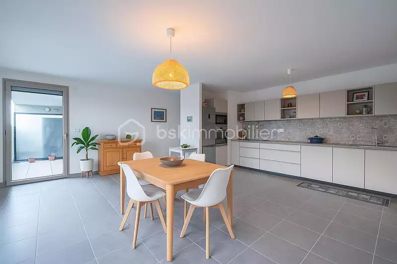 L'entrée dispose de grands placards et ouvre sur un séjour spacieux avec une cuisine ouverte entièrement équipée et aménagée installée en 2021 avec plaques à induction, four, micro-ondes et lave-vaisselle encastrés.