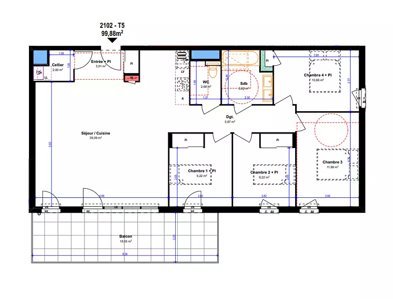 | 99 m² - 5 pièces - 4 chambres | Orientation : Sud |