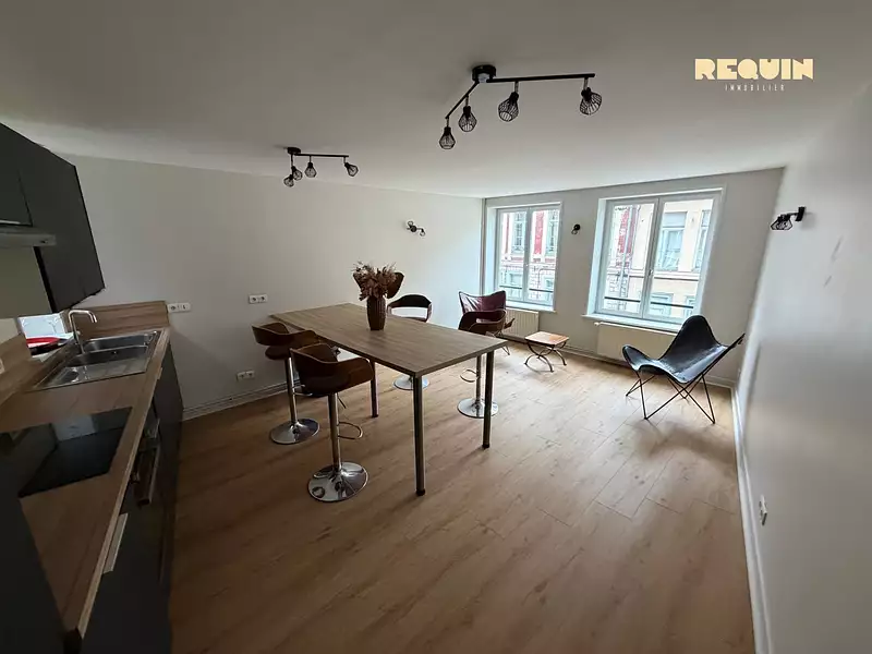 Vieux Lille - Superbe opportunité ! Ensemble Immobilier de 2 appartements en mono propriété ( 2 lots cadastrés. Idéalement situé rue de Saint André, vous serez sous le charme de ce premier appartement de 83 m² LC ( 90m² au sol ) moderne et ayant conservé son charme d'époque grâce à ses poutres apparentes. L'appartement dispose de deux espaces de vie, l'un au 1er étage avec une cuisine américaine totalement équipée et au second un séjour plus cosy propice à la détente. Il y a deux chambres séparées avec toutes deux de nombreux rangements et une grande mezzanine peut faire office de 3ème chambre. Idéal pour une recherche d'appartement typique du Vieux Lille. Le second, un studio très lumineux, avec SDD et WC. Parfait pour du patrimoine ou pour de l'investissement. Très bon rapport qualité/prix !