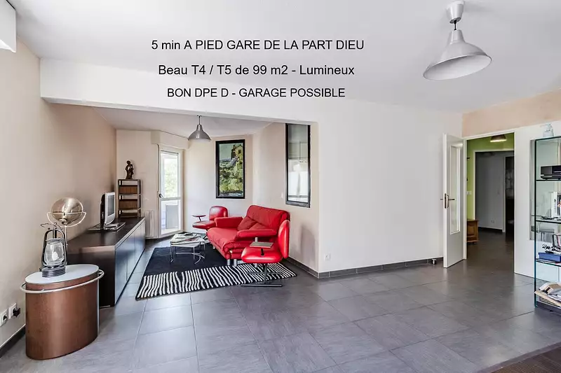 Exclusivité - Emplacement Prisé : à 5 mn à pied des Métro ligne B, Tramways T1 - T3 - T4, Bus, Centre Commercial de la PART DIEU. Découvrez ce spacieux appartement T4 / T5 de 99,42 m² carrez, agrémenté d'une loggia de 4,08 m², situé au 3ème étage avec ascenseur dans une copropriété de 1988, parfaitement entretenue. BON DPE D. Garage possible. Façade refaite.