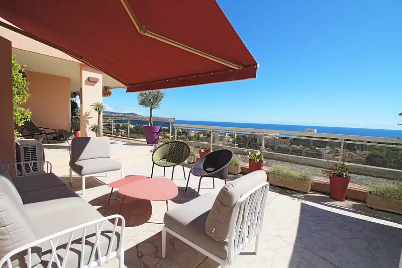 EXCLUSIVITE BAS FABRON / Nice Ouest VILLA SUR LE TOIT/ ROOF TOP AVEC VUE MER PANORAMIQUE ET PISCINE AU CALME. Découvrez cet appartement 4 pièces au DERNIER ETAGE en retrait de la route au calme bénéficiant d'un accès immédiat à toutes les commodités. Imaginez votre quotidien à seulement quelques minutes à pied du bord de mer, de la plage, des commerces et du tramway (ligne 2), combinant ainsi le meilleur de la vie citadine et la sérénité d'un emplacement privilégié VUE MER. Dès l'entrée, vous serez séduit par les volumes et la luminosité de cet appartement de 100 m² (99,39m2 loi Carrez) en parfait état. La distribution du bien et les finitions soignées créent une atmosphère à la fois moderne et chaleureuse. Chaque pièce ouvre sur la terrasse ou un balcon par une porte fenêtre coulissante. La Cuisine indépendante équipée dans le prolongement du séjour complète les 3 chambres, 2 wc, 2 salles d'eau et un dressing + multiples placards. Volets roulants et stores extérieurs électriques, double vitrage, climatisation réversible, porte blindée et installation électrique sans anomalie (tableau électrique neuf) pour le côte technique. Le véritable spectacle se déroule à l'extérieur. Une somptueuse terrasse de près de 100 m² ceinture l'appartement, offrant une vue panoramique époustouflante sur la mer et les environs. Cet espace exceptionnel, véritable jardin suspendu, deviendra le théâtre de vos moments de détente et de convivialité laissant place à toutes vos envies et idée d'aménagement. Le calme vous fera oublier que vous êtes en ville. Pour parfaire ce cadre de vie privilégié, la résidence sécurisée met à votre disposition une superbe piscine récemment refaite et les services d'une gardienne à demeure, garantissant votre tranquillité d'esprit. Deux stationnements dont un garage fermé ainsi qu'une cave complètent ce bien. De plus, la facilité de stationnement en dehors de la copropriété est un atout non négligeable pour recevoir vos invités. Charges annuelles courantes 6.649 euros (soit 550 euros par mois environ incluant, eau froide et chaude, ascenseur, entretien, gardien, piscine, charges communes). Les honoraires de l'agence seront exclusivement à la charge du vendeur. Classe Energie C Climat A. Les informations sur les risques auxquels ce bien est exposé sont disponibles sur le site Géorisques : www.georisques.gouv.fr.