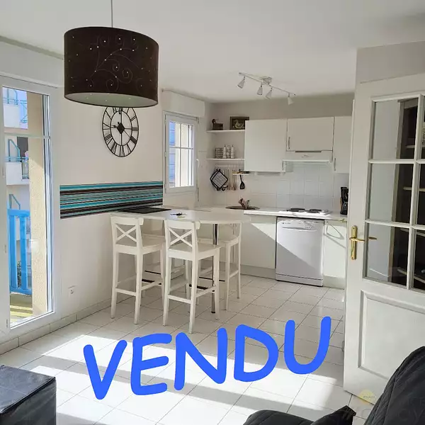 Situé en centre ville, proche plage, Salon séjour balcon exposition Est, coin cuisine équipée Chambre avec balcon, cabine, salle de douches, W.C indépendant 2éme étage 1 place de Parking