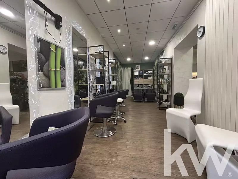 8,50 m², offrant une excellente visibilité. L’espace coiffure dispose de 2 bacs de lavage et 3 postes de coiffage, complété par 2 cabines d’esthétique pour les prestations de soins, une pièce pour entreposer les produits et un coin repas.