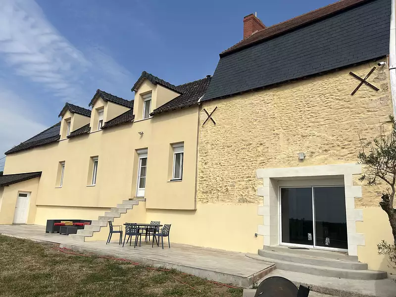 La batisse principale, superbe longére en pierre entièrement rénovée, d'environ 226 m2 habitables : vaste séjour lumineux, deux cuisines équipées, 4 chambres, une salle de bain, deux salles d'eau, allie à la perfection, authenticité et confort contemporain. Grande terrasse, cave, garage.