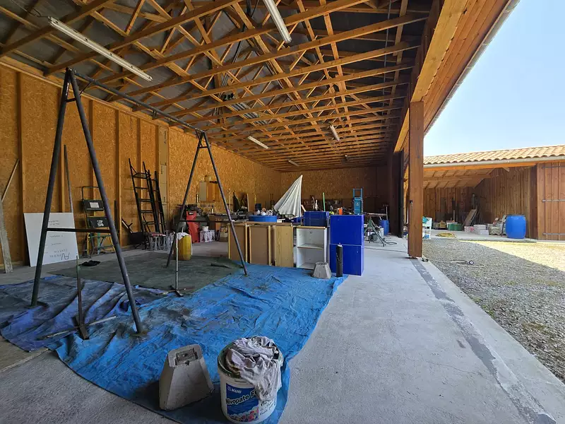 En 2020, une dalle béton a été coulée avec pour projet de réaliser un atelier / bureau (eau, électricité et assainissement en place). La surface au plancher de l'ensemble est d'environ 195 m².