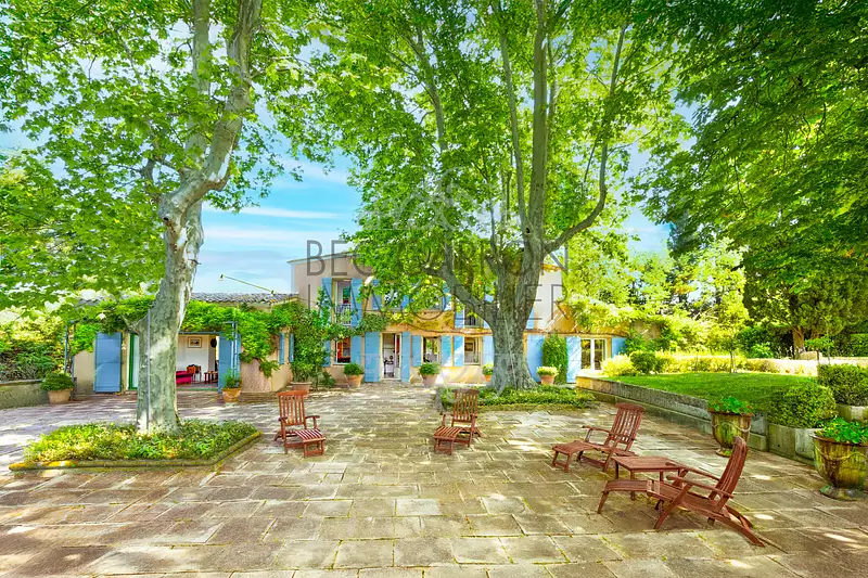 Le parc, soigneusement structuré, mêle végétation méditerranéenne, jardins à la française et roseraie délicate. Un espace extérieur dédié à la réception, ombragé par de majestueux platanes, rappelle l’ambiance d’une placette provençale, idéale pour les repas en plein air ou les moments de détente.