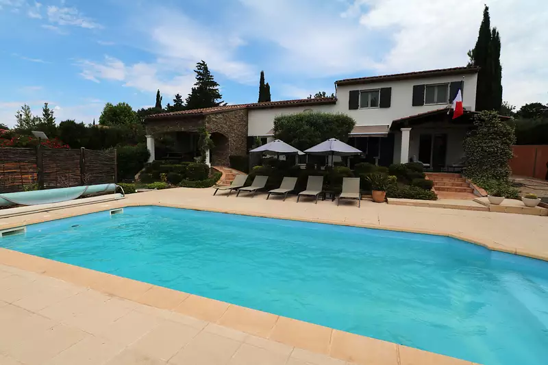 Découvrez cette somptueuse villa de type hacienda de 260 m2, édifiée sur un vaste terrain arboré de 5300 m2 avec 39 oliviers. Offrant un cadre de vie exceptionnel à seulement 30 minutes des plages méditerranéennes, cette propriété séduit par ses volumes généreux et ses prestations haut de gamme : double séjour lumineux, cuisine américaine équipée, 4 chambres spacieuses dont une en rez-de-chaussée, appartement indépendant 3 pièces, double garage avec atelier, piscine, climatisation intégrale, et studio supplémentaire dans une petite maison au fond du jardin. Exposée plein sud, la villa bénéficie d'une luminosité optimale et d'un confort moderne (alarme, portail électrique, vidéosurveillance, vidéophone, porte blindée, ballon d'eau chaude neuf). Idéale pour une grande famille ou un projet de maison d'hôtes, elle offre calme, sécurité et proximité des commodités (écoles, commerces, gare, autoroute, aéroport à 65 km). Un véritable havre de paix à découvrir sans tarder !
