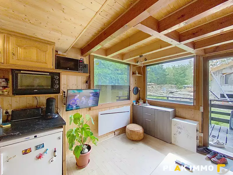 Charmant demi-chalet en duplex d'une superficie de 23,20 m2 Loi Carrez + 5,4 m2 hors Loi Carrez, offrant un cadre chaleureux et bucolique. Il dispose d’une agréable terrasse de 9 m2 exposée sud-ouest, prolongée par un jardin privatif, idéal pour profiter pleinement de l'extérieur aux beaux jours.