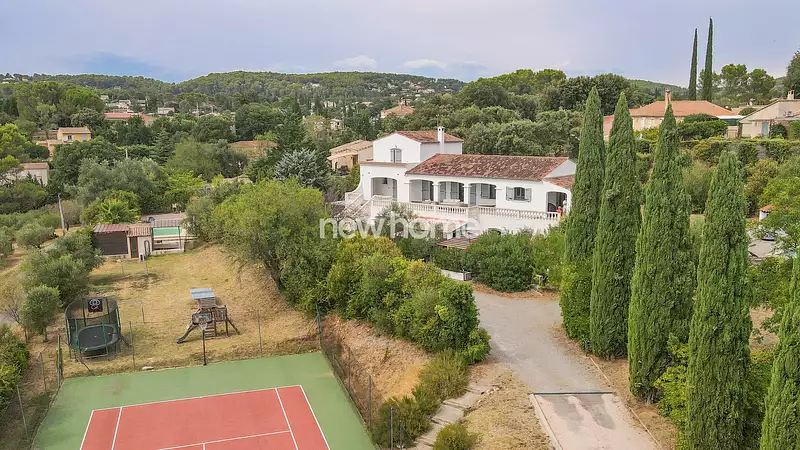 Rare ! A pied du centre, cette superbe propriété s’étend sur un terrain en position dominante de 6260m2, offrant un cadre de vie privilégié et une vue panoramique imprenable. Construite en 1984 et entièrement rénovée en 2022, la maison principale de 154 m2 sur 2 niveaux comprend un vaste séjour lumineux avec salle à manger, s’ouvrant sur une grande terrasse face à une oliveraie, ainsi qu’une cuisine moderne ouverte sur une terrasse donnant sur la piscine de 12x5 mètres. Une chambre avec dressing, une salle d’eau, un bureau et un WC indépendant complètent le rez-de-chaussée, tandis qu’à l’étage vous attend une grande chambre avec terrasse offrant une vue exceptionnelle sur la nature, accompagnée d’une salle d’eau et d’un WC séparé. En rez-de-jardin, vous profiterez également de deux gîtes indépendants : l’un de 83 m2 avec 2 chambres, l’autre de 57 m2 avec une chambre, chacun doté d’une belle véranda et pergola bioclimatique, d’une piscine privative de 8x4 mètres. La propriété comprend aussi une buanderie et deux caves. Pour compléter ce cadre privilégié à deux pas du village, un terrain de tennis, une salle de sport et une salle de jeux viennent agrémenter ce bien d'exception, idéal pour les amateurs de sport et de détente. Un véritable havre de paix à découvrir sans tarder !