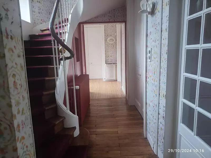 L’entrée, baignée de lumière matinale, dessert plusieurs espaces de vie : salons, salles de réception, bureau, cuisine ainsi qu’un escalier menant au niveau nuit. À l’étage, vous trouverez 4 chambres, 3 salles de bains et un grenier offrant encore du potentiel d’aménagement.