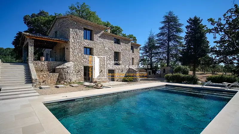 La pièce de vie offre sur 112 m2 un espace salon, un espace dînatoire que prolonge la cuisine semi-ouverte. Cœur de la Bastide, la pièce de vie surpend par sa hauteur de plafond (toit cathédrale) et sa luminosité car ouverte sur les terrasses, la piscine et la nature, sur 4 côtés, par de larges baies à galandage et des paroies vitrées. Pour la nuit, 5 chambres avec leur salle bains/douche ou salle d'eau. 3 chambres sont en rez-de-jardin. La suite parentale (45 m2) occupe le premier étage avec une seconde chambre. Dressing, buanderie, cave à vin. Le Design est sobre, les lignes épurées, et les matériaux nobles : pierre, bois, acier, verre. La climatisation par le sol (chaud/froid) est doublée par une climatisation réversible. Le garage (49 m2), équipé d'une borne de recharge Tesla, communique avec l'habitation. Une dépendance de 73 m2, située à une centaine de mètres de la Bastide est aussi entièrement rénovée (isolation, eau, électricité) et peut faire office d'habitation, d'atelier ou de garage de complément. La piscine (12 x 6 m), exposée sud-ouest est entourée de terrasses solarium et domine une vallée. Aucun vis-à-vis, ni voisin sur 360 degrés, car la Bastide est située au centre du domaine. Domotique, stores automatiques, aspiration centralisée, système de sécurité par caméras, courant triphasé.