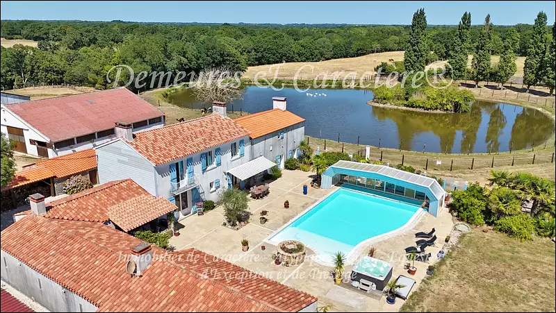 Bénéficiant des avantages de la campagne, de la ville et du littoral, au calme, à l’abri de l'agitation, du voisinage et bien cachée au bout de sa longue impasse, cette propriété de + 26 hectares libres de toute location offre : Habitation principale (231 m2 - 4 chambres dont suite en RC) ; Habitation secondaire de plain-pied (ou gîte) (72 m2 - 2 chambres) ; Vaste terrasse paysagée avec espace baignade/détente comprenant grande piscine chauffée et jacuzzi sous abri escamotable ; Bureau/boutique/atelier artisanal (29 m2) avec sanitaires ; Dépendances (changement de destination et aménagement partiellement possibles pour divers projets) dont : Longère (80 m2 de plain-pied - 3 pièces + bucher) ; Grange (330 m2 dont couloir de 5 boxes + 2 boxes de naissance) ; Hangar (200m2) ; Stabulations (75 + 70 m2) ; Appentis (90 m2) ; Abris pour chevaux ; Poulailler, etc... Les extérieurs sont constitués de : Cour et surface stabilisée, jardin, grande terrasse ensoleillée avec espace baignade et détente (bassin à débordement de 65 m2 comprenant plage immergée, petit et grand bain, traitement au sel + jacuzzi), 2 petites terrasses couvertes, puits, mare avec source, étang sécurisé (5 000 m2), herbages pour production fourragère, paddocks et prairies clôturées, prairies boisées, enfin 1 000 m linéaires de berge de rivière (apportant une agréable touche de fraîcheur aux périodes estivale ; sans aucun risque d'inondation car situés en contrebas de la propriété), ... Plus en détail la maison est constituée de : Hall d'entrée avec rangements ; Dressing ; Sanitaires/WC suspendu avec fenêtre ; Pièce de vie (77 m2) avec cuisine AE ouverte (+ porte-fenêtre vers terrasse), espace salle à manger, salon face cheminée (poêle à bois STOVAX - AASGARD) et coin TV aménagé/sonorisé ; Suite parentale (27 m2) dont chambre 1 (avec porte-fenêtre vers terrasse)et salle de douche (meuble vasque, douche italienne, sèches-serviettes, rangement, fenêtre) + communication vers atelier artisanal. À l'étage : Bureau et espace billard en mezzanine sur la pièce de vie ; Palier desservant Chambres 2 et 3 (13 m2 / 13 m2) ; Salle de douche (vasque, douche, sèche-serviette, fenêtre) ; WC suspendu (indépendant) avec lave-mains et fenêtre ; Chambre 4 en suite (22,2 m2) avec salle de bain (meuble vasque, baignoire, sèche-serviette, fenêtre). Habitation secondaire (possible gîte) comprenant : Pièce de vie (36,5 m2) avec cuisine ouverte, coin repas, coin salon avec cheminée-rotissoire monumentale et diverses baies vitrées ouvrant sur terrasse extérieure et couverte, dégagement, chambres 5 (11 m2) et 6 (14,2 m2) avec placards, salle d'eau (meuble vasque, douche, fenêtre) ; WC séparé. Confort et technique : VMC neuve ; Huisseries PVC double vitrage OB en principal ; Volets traditionnels PVC en principal ; Chauffage central produit par chaudière fioul et distribué par plancher chauffant en RC et radiateurs hydrauliques à l'étage ; ECS produite par chaudière ; Radiateurs et cumulus électriques pour l'habitation secondaire ; Remarquable poêle à bois STOVAX - AASGARD pour les périodes d'intersaison et le plaisir des feux de bois ; Eau potable du réseau public (compteur avec abonnement traditionnel pour les habitations + compteur avec abonnement élevage pour le reste de la propriété) ; Assainissement autonome conforme ; Portail commandé ; Protection électronique / Contrat de télésurveillance* ; EDF triphasé ; Fibre internet raccordée ; Couverture tuile neuve en partie (+ remaniée, nettoyée et traitée pour le reste) ; Récents travaux d'entretien et d'amélioration (décoration, isolation supérieure, ...) ; Traitement et nettoyage des façades en cours… Taxe foncière : 3 300 €. Conso fioul annuelle : env. 2 500 l. ; Conso élec annuelle (pour résidence principale et secondaire + piscine et activités) : env. 2 500 €. Situation : Services, soins, commerces, petit centre commercial et autres commodités à 3km ; Grand pôle commercial, gare SNCF, hôpital, ... à 7km ; Plages, port de plaisance et golf 18 trous à 15km ; CHALLANS à 7km ; ST GILLES CROIX DE VIE à 15km, ST JEAN DE MONTS à 18km ; LA ROCHE SUR YON (gare TGV) à 25mn ; NANTES (aéroport) à 45mn ; Le Puy du Fou à 1h00 ; LA ROCHELLE à 1h30 ; PARIS à 4h00. Ce domaine offrant espace, calme, confort et potentiel sur 26,42 hectares libres constitue une offre particulièrement rare sur le marché immobilier régional / rétro-littoral des Pays de la Loire. Complément d’informations et visite sur demande référencée. Ce bien vous est présenté en EXCLUSIVITÉ par DEMEURES & CARACTÈRE - Cabinet Retz-Immobilier, spécialiste des biens immobiliers de Caractère, Atypiques, Ruraux, d'Exception et de Prestige. @MNNRICD - Contact : Chris DUBOIS. Référence du mandat exclusif présenté : no110926. - Annonce rédigée et publiée par un Agent Mandataire -
