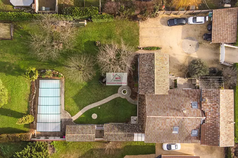 A l'extérieur on trouve une cuisine d'été , un atelier , une piscine couverte d'une dimension de 9X4,5 m et un beau terrain de pétanque, possibilité de stationner plusieurs voitures dont deux sous un carport de 32 m2. Cette propriété est implantée sur une parcelle de terrain de 11560 m2 dont une partie en zone AU .