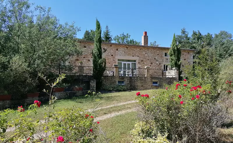A seulement trois minutes d'un village, cette très belle maison en pierre édifiée sur un terrain arboré de 4hectares, bénéficie d'un environnement privilégié sans vis à vis. Depuis le séjour avec accès sur la terrasse vous pourrez profiter d'une vue agréable et apaisante sur la forêt de la propriété et rejoindre le côté piscine, avec un espace détente et barbecue couvert. Les volumes intérieurs sont généreux: séjour avec cheminée et trois chambres en rez-de chaussée. A l'étage, trois chambres dont une grande avec une spacieuse salle de bain et terrasse avec vue sur le jardin. Possibilité de convertir les deux bureaux en chambres supplémentaires.