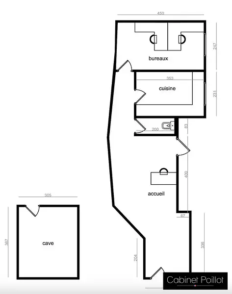- Vitrine de 2m linéaires, grande entrée (pouvant servir d'espace d'accueil), dégagement donnant accès à un WC individuel, une grande cuisine aménagée et équipée (possibilité 2ème bureau) et un grand bureau.