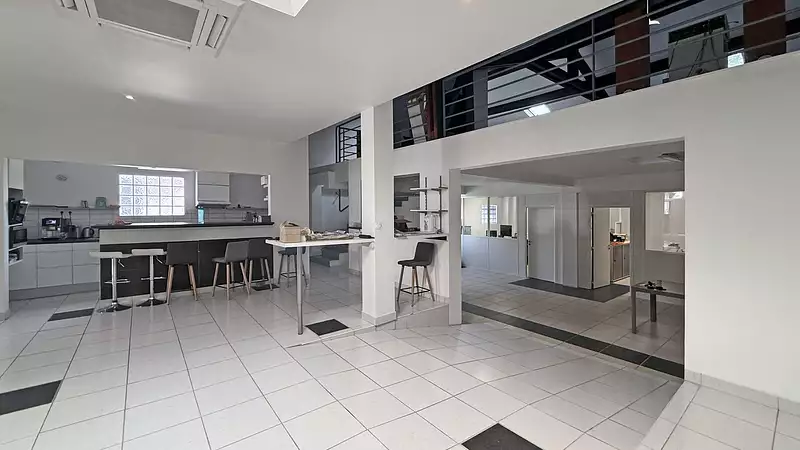 Au calme, dans un quartier pavillonnaire, ce local comprend actuellement trois bureaux, un atelier, une cuisine ouverte sur un espace à vivre ou d'activité de 140 m2, une mezzanine de 90 m2, une salle d'eau, 2 wc et un garage 2 places (voire plus selon aménagement).
