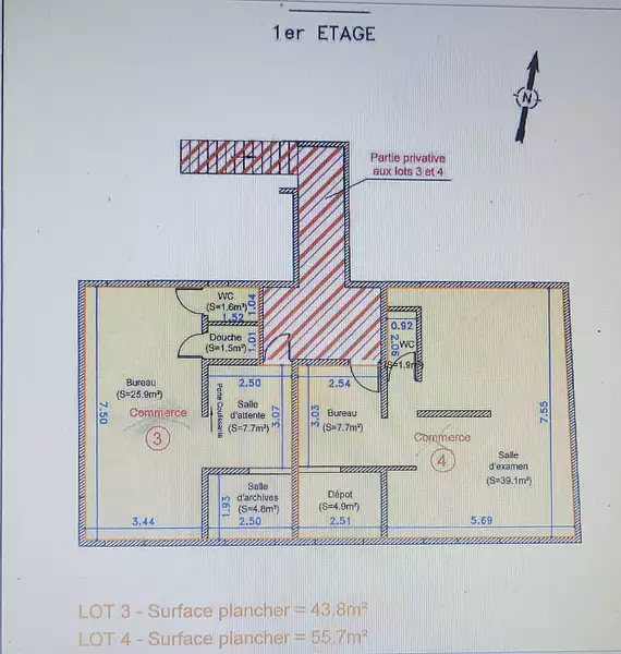 Il se compose d'une pièce principale de 39.1M2, d'un bureau de 7.7M2, d'un dépôt de 2.5M2, d'un WC de 2M2.