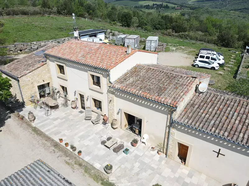 Située à 15 minutes de Limoux et de ses commerces, propriété de 41 Ha95a avec superbes vues et un lac en retenue collinaire, comprenant une habitation principale en pierres, des dépendances diverses, un gîte, une remise, un chenil. D'une surface habitable de 275m2, l'habitation principale se compose de : Au rdc : un séjour / cuisine aménagée et équipée avec espace bar de 67 m2, un salon ouvert vers le séjour de 30 m2, un WC, une suite parentale de 38 m2 comprenant : un dressing de 12 m2, une salle d'eau de 11 m2, une chambre de 15 m2, une buanderie. À l'étage 1er escalier : une mezzanine de 13 m2, une chambre mansardé de 13 m2. A l'étage par le 2ème escalier : une chambre de 19 m2 avec salle de bains de 12 m2, une salle d'eau, une chambre de 11 m2, une chambre de 16 m2 avec placard, une chambre de 15 m2 avec placard, un WC. Attenant à l'habitation principale : rdc : un local de chaufferie de 10,5 m2, une cave de 10,6 m2 . A l'étage : une salle de jeux de 25,5 m2 de surface utile (12 m2 en loi carrez), Attenant à cette section : Une salle composée d'une grande pièce de 31,1 m2 avec une mezzanine de 25,3 m2. Un gîte de 53,8 m2 se composant de : En rez-de chaussée : un séjour / cuisine aménagée de 27,9 m2. À l'étage : deux chambres de 10,3 et 9 m2, une salle d'eau. À l'extérieur , face à l'habitation : une remise de 150 m2 au sol, une une pièce de 21,8 m2, un chenil en partie couvert et clôturé. spécialiste de l'immobilier Limouxin, Razès, Haute-Vallée de l'Aude, Quercorb, Mirepoix, Plateau de Sault, Corbières vertes, depuis plus de 25 ans.