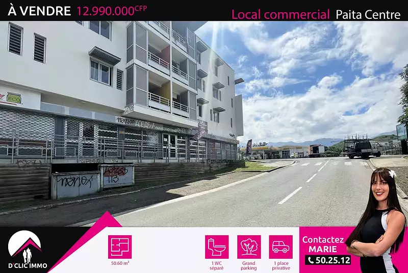 Idéalement situé au coeur de Paita Village, proche de l'axe principal, l'agence D'CLIC IMMO vous propose en exclusivité un spacieux local commercial / bureau d'environ 50.60m² + 1 emplacement de stationnement privatif + parking devant le local, situé au RDC d'un immeuble composé d'appartements et de plusieurs locaux commerciaux permettant une belle complémentarité d'activités et un flux de clientèle (salon de coiffure, boulangerie, pizzeria, bureaux).
