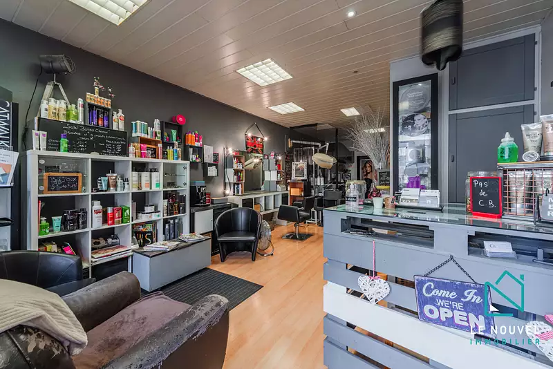 Le local situé au RDC fait 51,34 m2, il dispose d'une salle de coiffure, d'une arrière boutique, d'un dégagement donnant sur une cuisine et WC.