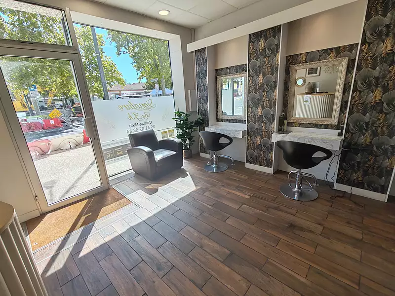 2 bacs à shampoing, 5 postes de coiffage, comptoir accueil