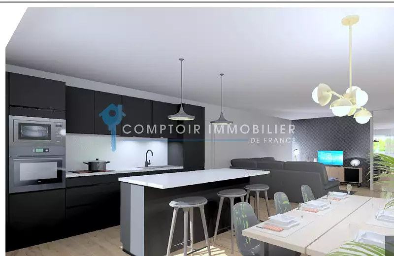 T3 d'environ 57m2 en rez-de-chaussée ; une grande pièce de vie avec salon/ séjour et cuisine ouverte de 26m2.