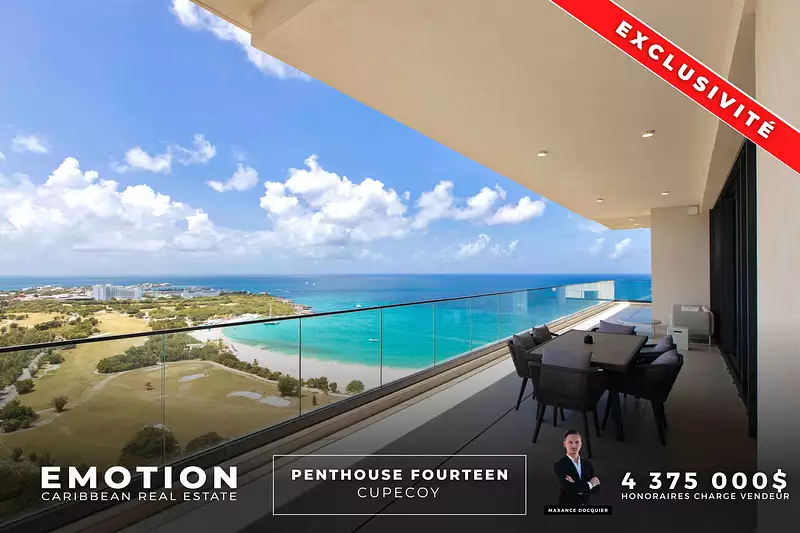 Le cabinet EMOTION REAL ESTATE, représenté par votre agent Maxance DOCQUIER, est fier de vous présenter en exclusivité un bien d'exception situé au vingtième et dernier étage d'une résidence prestigieuse livrée en 2022. Ce penthouse, le plus élevé de l'île de Saint-Martin/Sint Maarten, offre une superficie intérieure de 295 mètres carrés et plus de 300 mètres carrés de surface extérieure. Il est vendu entièrement meublé et équipé.