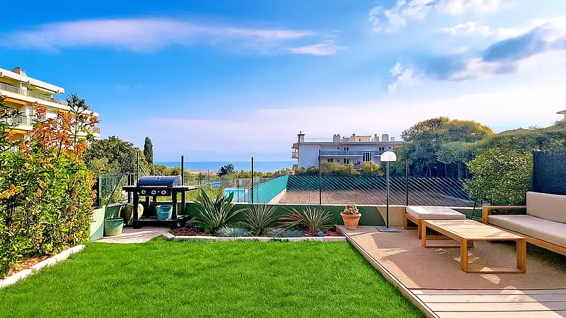 Vue mer depuis toutes les pièces, belle terrasse et petit jardin privé prolongent agréablement l’espace de vie.